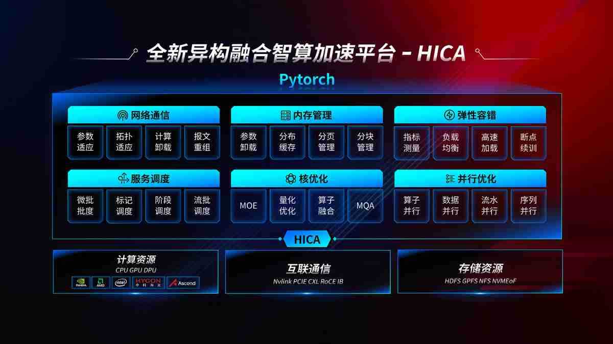 通过自研的服务层、、中间适配层、、以及调度编排算法,,采用数据并行、、模型并行等多种并行方式,,,,把并行计算任务进行有效的分解,,使其分别由相应的软件栈和算力资源来承接。。。当GPU资源变化,,HICA可以实时动态调度计算子任务并调整模型拓扑和架构,,,以充分聚合各种算力资源。。。