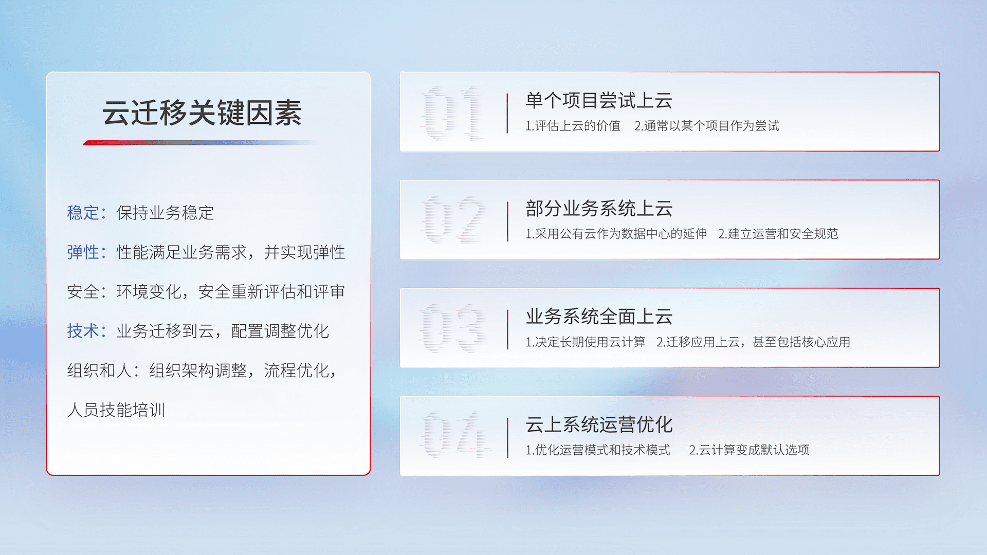 结合实际业务,,,从规划设计、、云平台选型、、云原生改造、、、、数据迁移、、、集成交付,,,,迁移全过程为客户识别最佳上云路径,,,,做好风险识别管理,,设计网络架构、、、身份权限、、安全审计合规、、、、操作审计、、、、日志审计、、监控告警策略、、多站点容灾设计等,,,对云上基础设施进行整体规划,,,提升IT治理水平,,,,以满足弹性、、、高可用、、高性能的需求。。